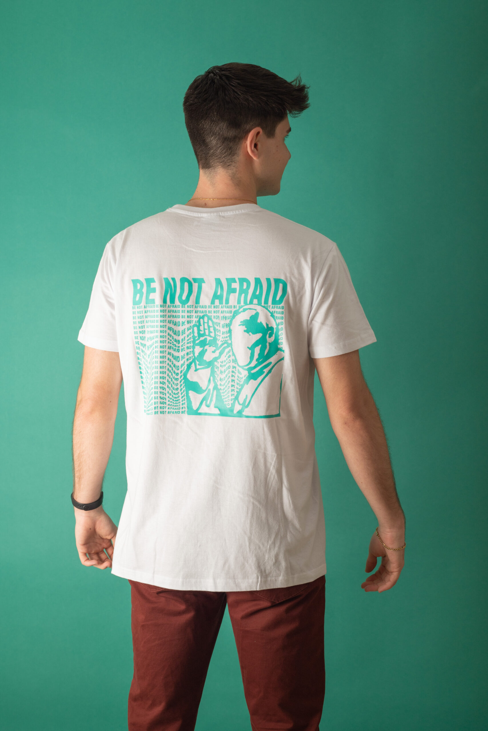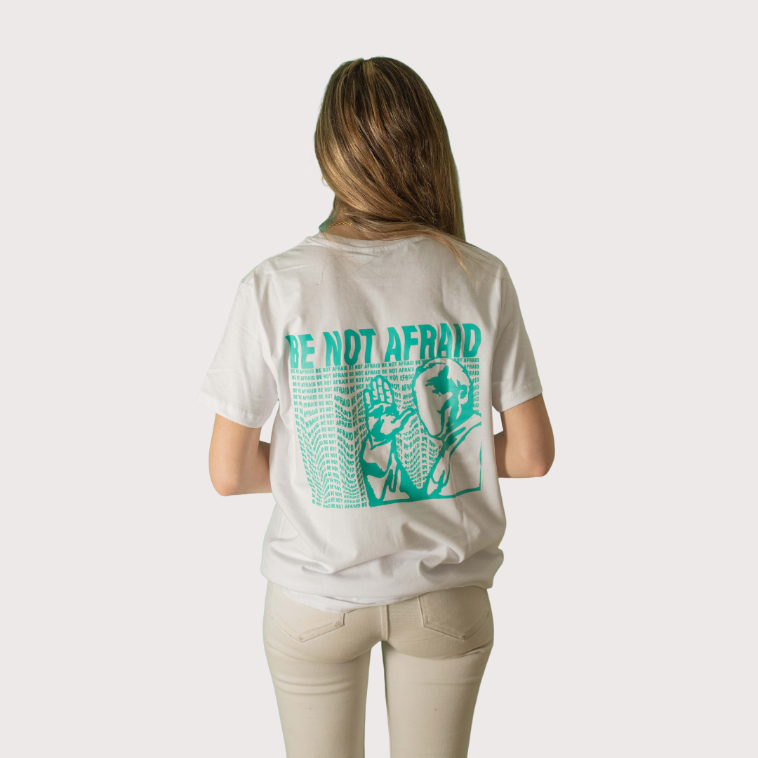 ¡No tengáis miedo!, gritó el Papa San Juan Pablo II a todos los jóvenes. No tengáis miedo a dar la batalla espiritual que el mundo necesita. No tengáis miedo a poner la otra mejilla, a decir sí a Cristo sin complejos. Con esta frase del Papa Juan Pablo II queremos transmitir la alegría de dar la vida por Jesús. El Papa nos invitó entonces a vivir sin miedo ni complejos y hoy el mundo necesita de cristianos valientes que den testimonio de su fe. En España somos unos afortunados. Pero seguir a Cristo no es sencillo en todos los rincones del mundo. Precisamente por eso los beneficios de esta camiseta están destinados a la Parroquia Sagrada Familia de Valencia (Venezuela), donde muchos de los jóvenes necesitan de ayuda económica para salir adelante. Nunca antes ayudar a los demás había sido tan sencillo como comprar una camiseta. ¡No tengas miedo!