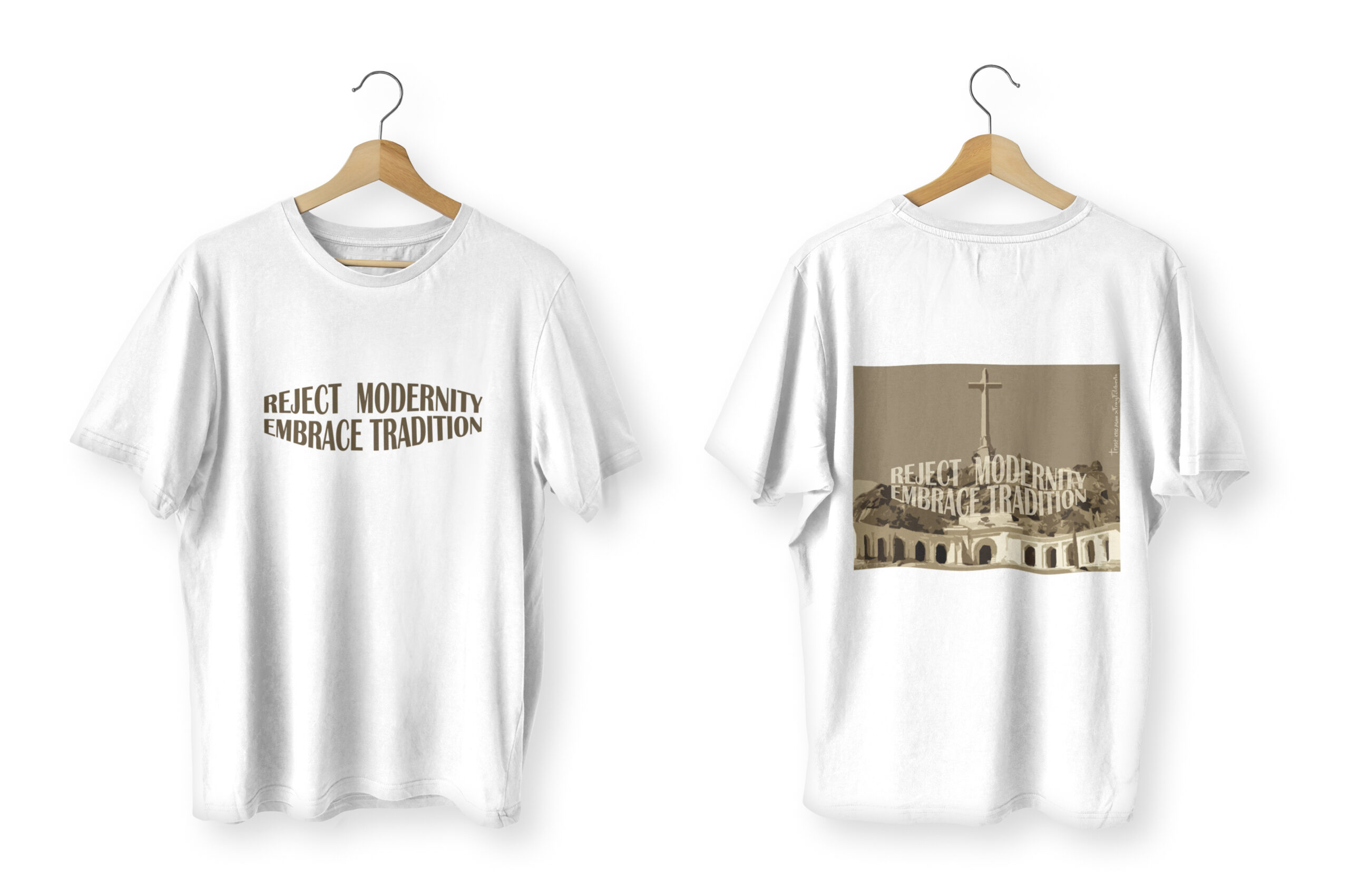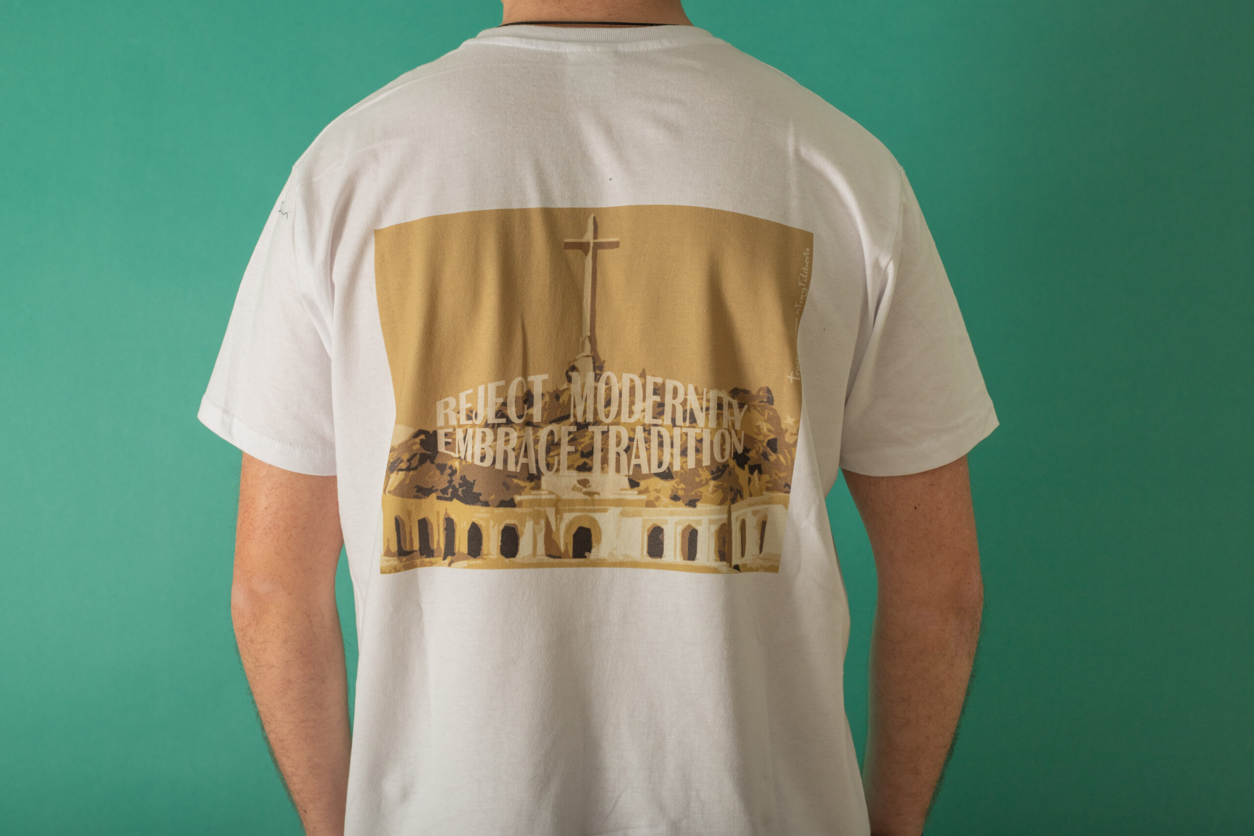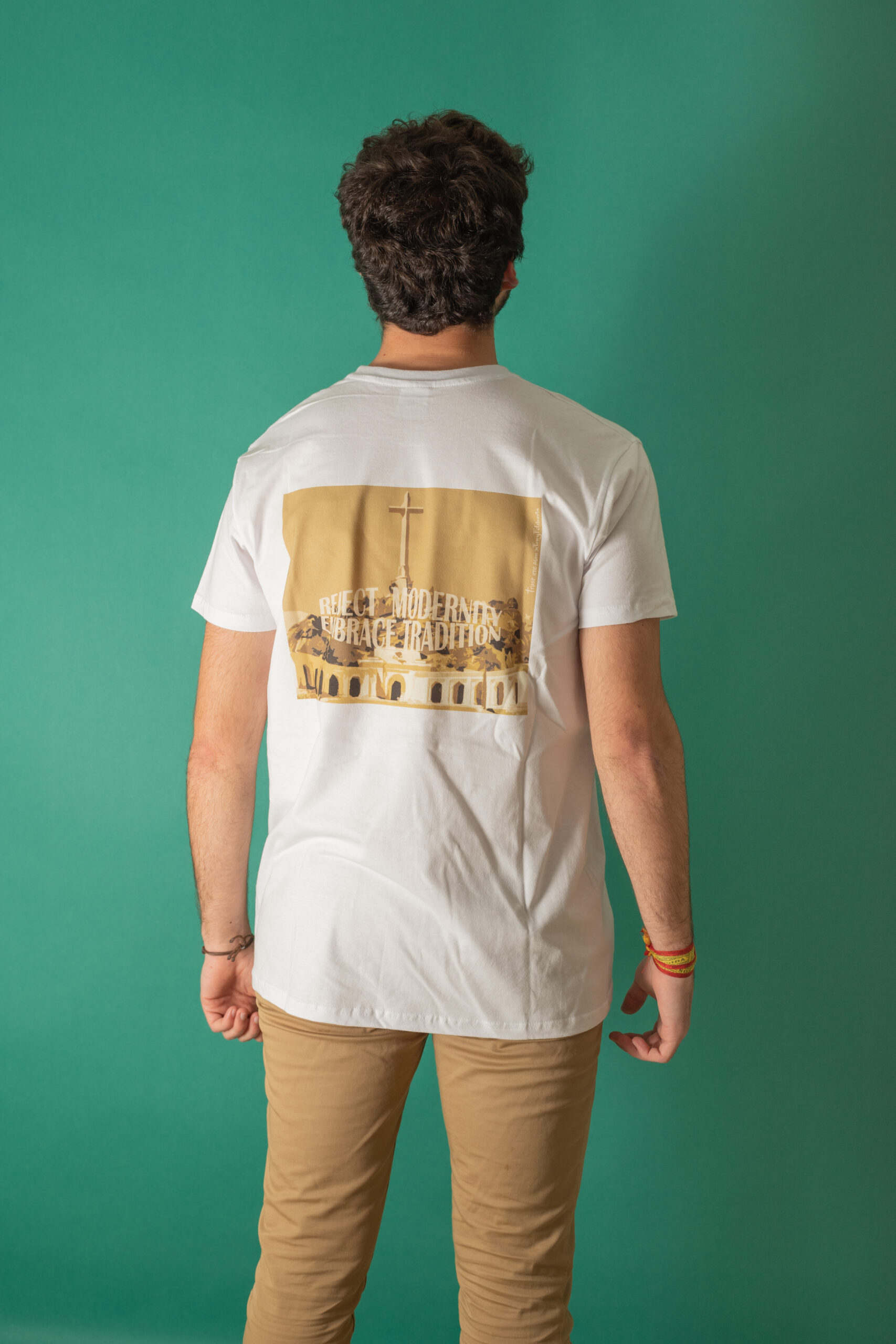 En un mundo frenético donde el cambio está a la orden del día, es importante dirigir la mirada a la retaguardia orante de Occidente. Cuántas veces nos vemos inmersos en esta espiral de progreso sin límites que nos eclipsa con su ruido y sus neones. Cuántas veces somos rehenes del frenesí de la modernidad. Frente a eso, los cristianos debemos recuperar la oración y el silencio. ¡Cuánto ejemplo nos dan aquellos que sostienen el mundo con sus oraciones! Por eso esta camiseta nos invita a meditar sobre la vida contemplativa que llevan muchas comunidades, como la Abadía Benedictina de la Santa Cruz del Valle de los Caídos. Queremos destinar los beneficios de esta camiseta a la Abadía Benedictina y a la Escolanía del Valle de los Caídos, que cuidando la liturgia y la oración nos cuidan a todos nosotros y nos enseñan a volver la mirada a lo verdaderamente importante.