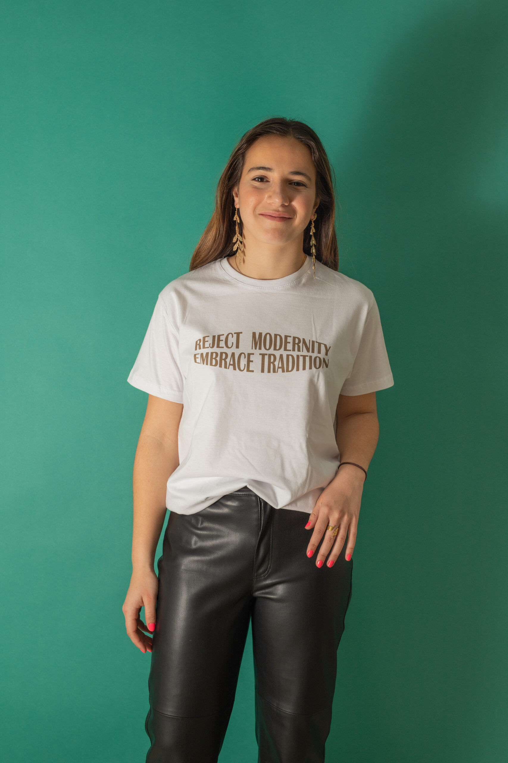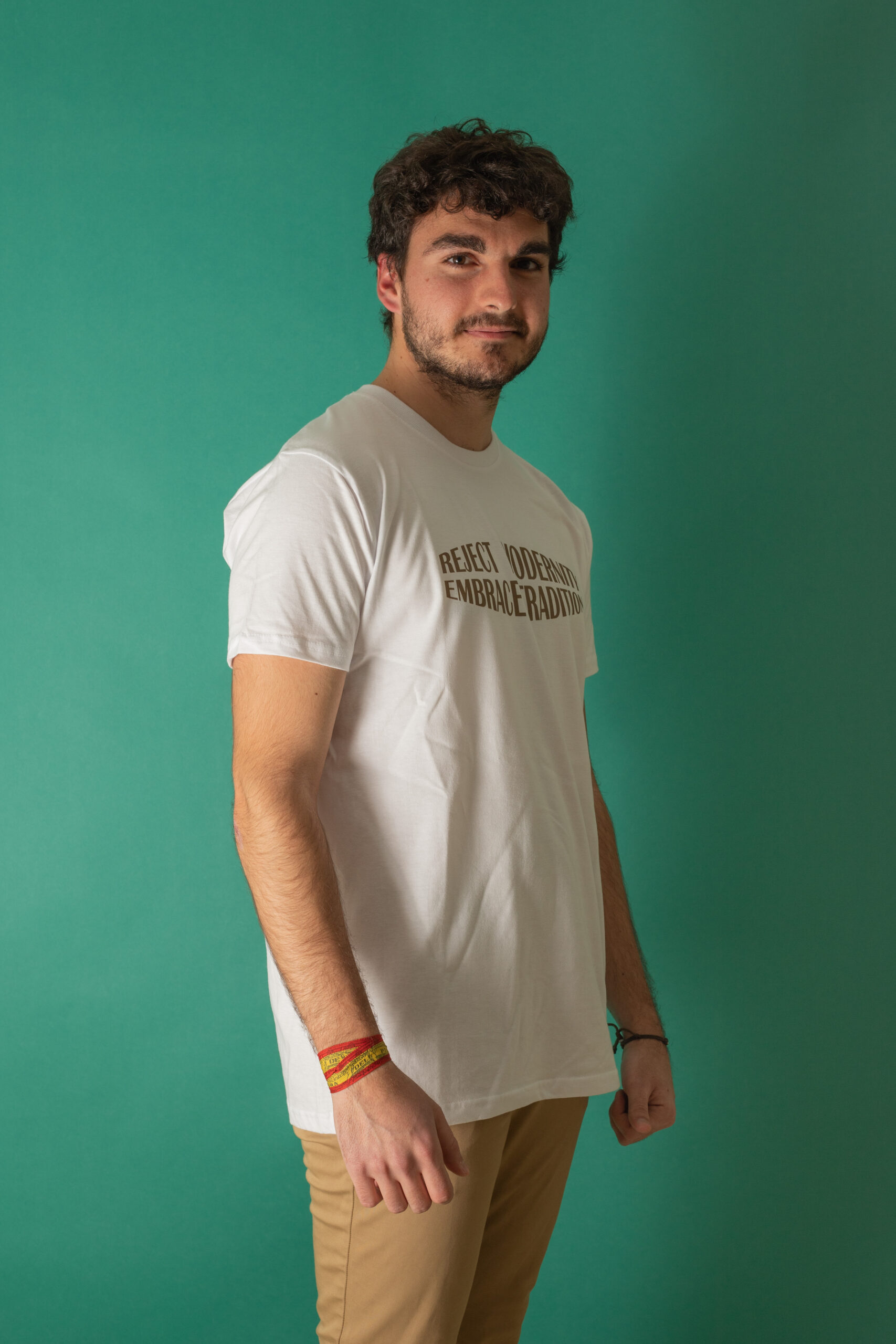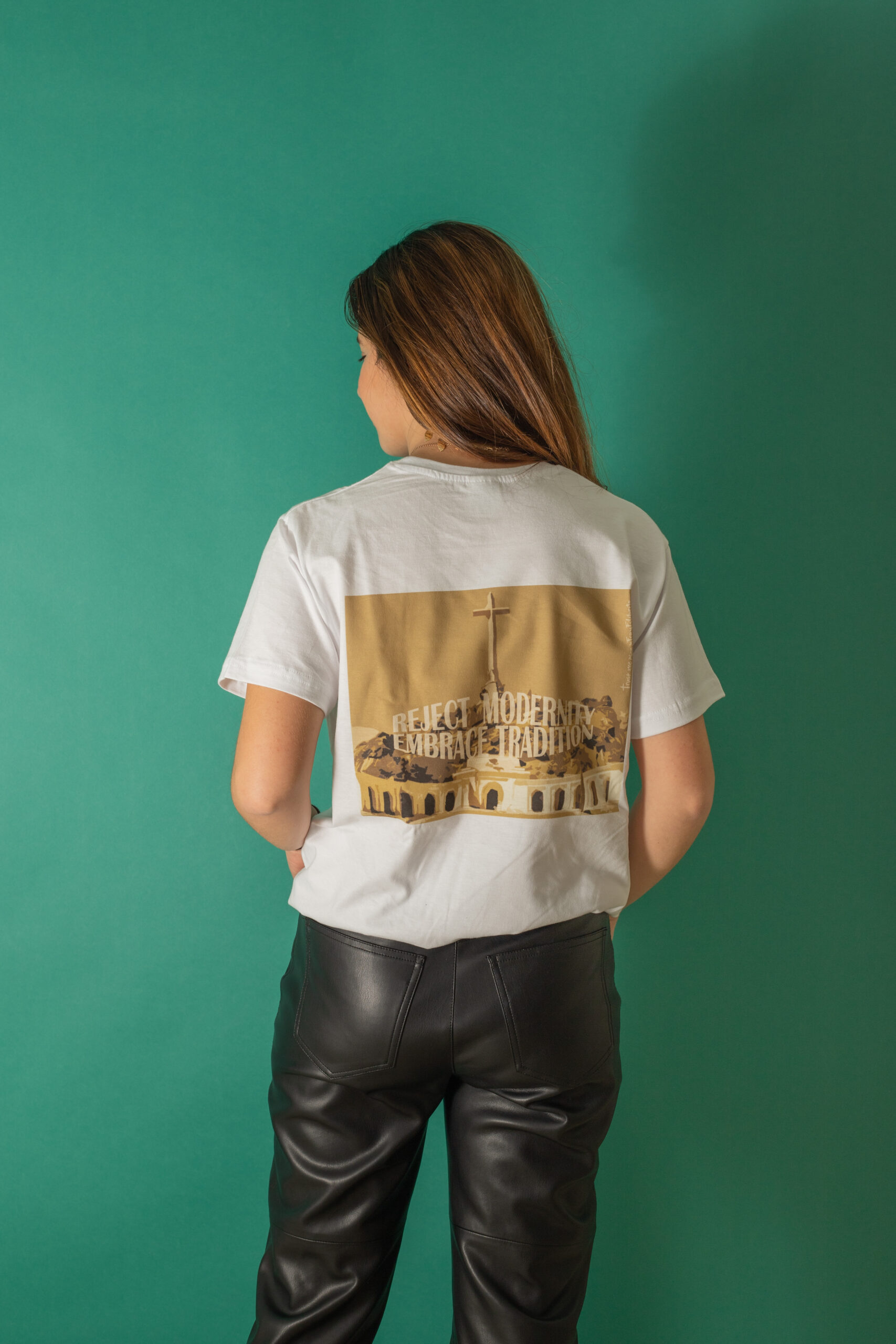 En un mundo frenético donde el cambio está a la orden del día, es importante dirigir la mirada a la retaguardia orante de Occidente. Cuántas veces nos vemos inmersos en esta espiral de progreso sin límites que nos eclipsa con su ruido y sus neones. Cuántas veces somos rehenes del frenesí de la modernidad. Frente a eso, los cristianos debemos recuperar la oración y el silencio. ¡Cuánto ejemplo nos dan aquellos que sostienen el mundo con sus oraciones! Por eso esta camiseta nos invita a meditar sobre la vida contemplativa que llevan muchas comunidades, como la Abadía Benedictina de la Santa Cruz del Valle de los Caídos. Queremos destinar los beneficios de esta camiseta a la Abadía Benedictina y a la Escolanía del Valle de los Caídos, que cuidando la liturgia y la oración nos cuidan a todos nosotros y nos enseñan a volver la mirada a lo verdaderamente importante.